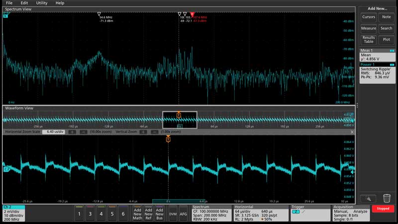 使用可選的頻譜視圖,結(jié)合波形和頻譜分析,快速進(jìn)行噪聲搜索