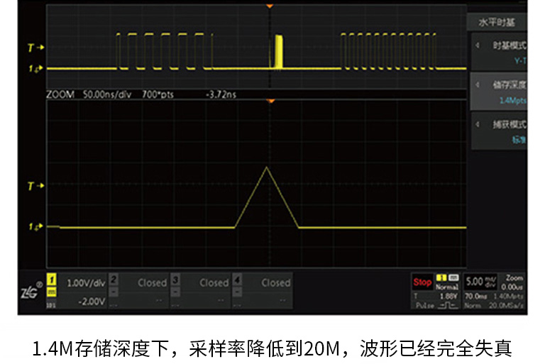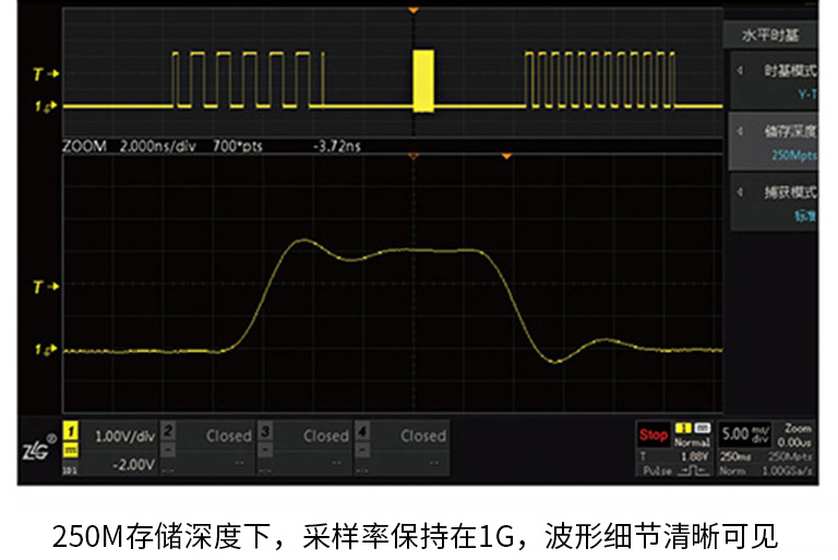 如果存儲深度能夠做到足夠大,就能保持較高的波形采樣率,則觀察到的波形會真實(shí)、細(xì)膩。反之,如果存儲深度只有1Mpts甚至低,當(dāng)要觀察時長較大的波形時,示波器就只能被迫降低采樣率。由于采樣點(diǎn)數(shù)不足,示波器顯示的波形也會嚴(yán)重失真,甚至產(chǎn)生波形混疊,誤導(dǎo)用戶測量分析。ZDS3000/2000B系列示波器創(chuàng)新性地采用DDR3存儲技術(shù),配合大規(guī)模的FPGA器件,通過全硬件加速和多線程并行處理,存儲深度高可達(dá)250M !在觀察長時間波形時也不丟失波形細(xì)節(jié)。
