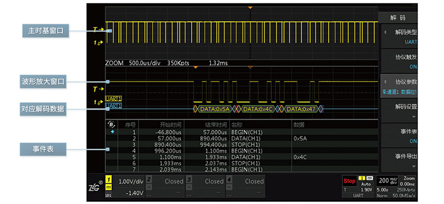 在調(diào)試協(xié)議信號的時候,不僅需要觀測協(xié)議波形,還要將波形解碼成對應(yīng)的數(shù)據(jù)。但一直以來各大品牌示波器的協(xié)議解碼功能都要付費(fèi)選配的,而且只有寥寥幾種。ZDS3000/2000B系列示波器基于客戶需求免費(fèi)配備了41/29種協(xié)議解碼,CAN、LIN、IIC、SPI、UART、USB、PS/2、DALI、Wiegand、1-Wire、DS18B20、HDQ、 SD_SPI、SD_SD、IrDA、Manchester、DiffManche、Miller、DHT11、 SHT11、 NEC、RC5、RC6、FlexRay等,除此之外,ZDS3000/2000B系列示波器還免費(fèi)配備了CAN FD協(xié)議解碼,再一次定義了200M示波器!