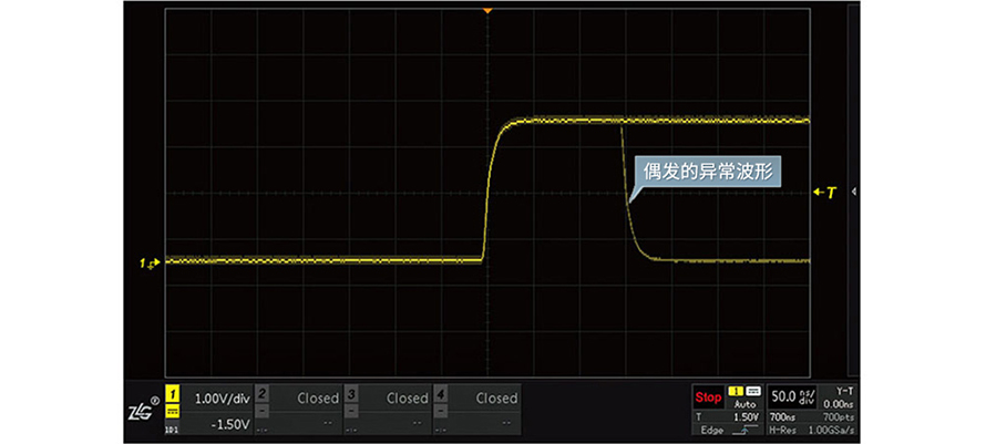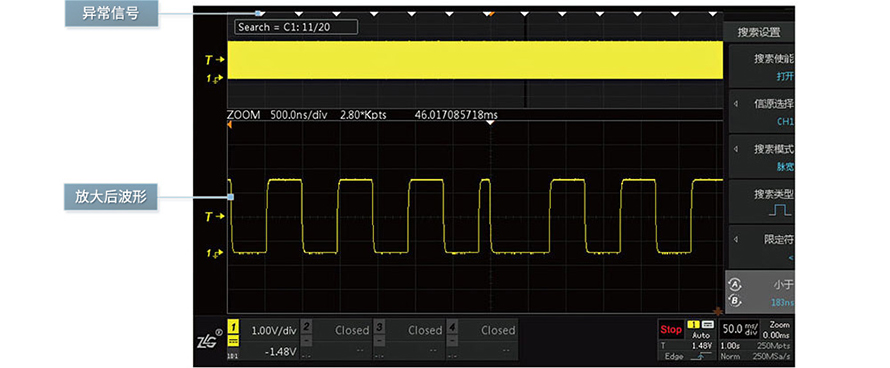 在調(diào)試信號波形時,我們需要明確信號是否出現(xiàn)了異常。如果出現(xiàn)了異常,那這些異常信號出現(xiàn)的頻率是多少,是不是周期性出現(xiàn)的呢?為了弄清楚這些問題,一般需要長時間記錄波形,然后基于這樣一個龐大的波形數(shù)據(jù)庫去定位異常波形出現(xiàn)的位置。ZDS3000/2000B系列示波器依托于海量存儲和硬件加速的優(yōu)勢,能夠從數(shù)十萬個波形中迅速定位出感興趣的信號,只要當(dāng)前屏幕內(nèi)出現(xiàn)了符合搜索條件的波形信號,系統(tǒng)都將自動地在對應(yīng)位置做上標(biāo)記,異常信號一覽無余。