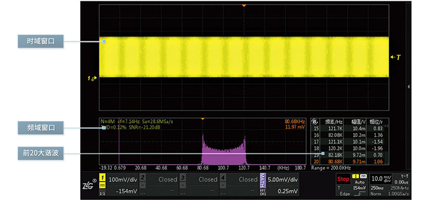 市面上多數(shù)2000系列示波器MAX只支持8K樣本點(diǎn)的FFT分析,在1G采樣率的情況下,頻率分辨率有125KHz,多數(shù)情況都無法準(zhǔn)確判斷信號頻譜分布。ZDS3000/2000B系列示波器拒絕單純的功能堆砌,內(nèi)部采用了專業(yè)的處理芯片,將FFT分析點(diǎn)數(shù)升級至4M樣本點(diǎn),同樣在1G采樣率的情況下頻率分辨率能準(zhǔn)確到250Hz,可以準(zhǔn)確分析出電路中的干擾噪聲來源,大大提高了示波器FFT的實(shí)用價(jià)值。4Mpts FFT分析功能,不僅僅是在量上突破,而且還是在質(zhì)上的飛躍。