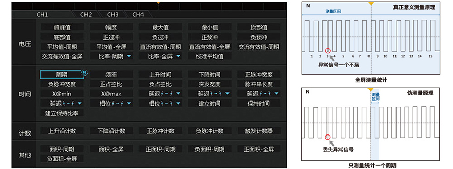僅僅通過波形的直觀表現(xiàn)來分析波形遠(yuǎn)遠(yuǎn)不夠,只有將波形各項(xiàng)指標(biāo)量化,才能看透波形異常的本質(zhì)。然而受限于架構(gòu)和芯片限制,絕大多數(shù)示波器的參數(shù)測量都是基于采樣結(jié)果進(jìn)行抽點(diǎn),無論屏幕中有多少個信號周期,都僅僅抽取每屏中的一個周期信號進(jìn)行統(tǒng)計(jì)測量,這也直接導(dǎo)致了結(jié)果的嚴(yán)重失真。為了實(shí)現(xiàn)意義的參數(shù)測量統(tǒng)計(jì),我們采用FPGA進(jìn)行全硬件加速,通過對屏幕上每一個周期信號的測量,計(jì)算出每一項(xiàng)指標(biāo)的MAX值,MIN值,平均值,標(biāo)準(zhǔn)差,實(shí)現(xiàn)了意義參數(shù)測量功能,并且多達(dá)50余種。
