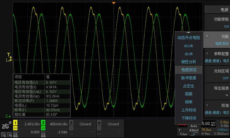 開關(guān)電源的質(zhì)量直接影響到產(chǎn)品的技術(shù)性能以及其安全性和可靠性。電源測試項(xiàng)目多,計(jì)算量大,統(tǒng)計(jì)繁瑣等問題一直困擾著工程師們,為了解決這些問題,致遠(yuǎn)電子在示波器中增加開關(guān)損耗、SOA、電感測試等電源分析功能。如在電感測試功能中可直接對電感、有功功率等項(xiàng)目進(jìn)行計(jì)算,方便工程師快速、準(zhǔn)確地測試電源產(chǎn)品。