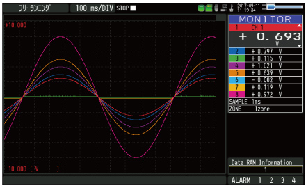 除了以下4幅畫面,還有測量數(shù)值表示和全波形表示的顯示畫面。 波形+測量數(shù)值表示 模擬波形+測量數(shù)值表示。 信號波形可按1?2?4?8的數(shù)量分區(qū)域顯示,每個區(qū)域可選擇輸入通道的顯示位置。 ![]() |