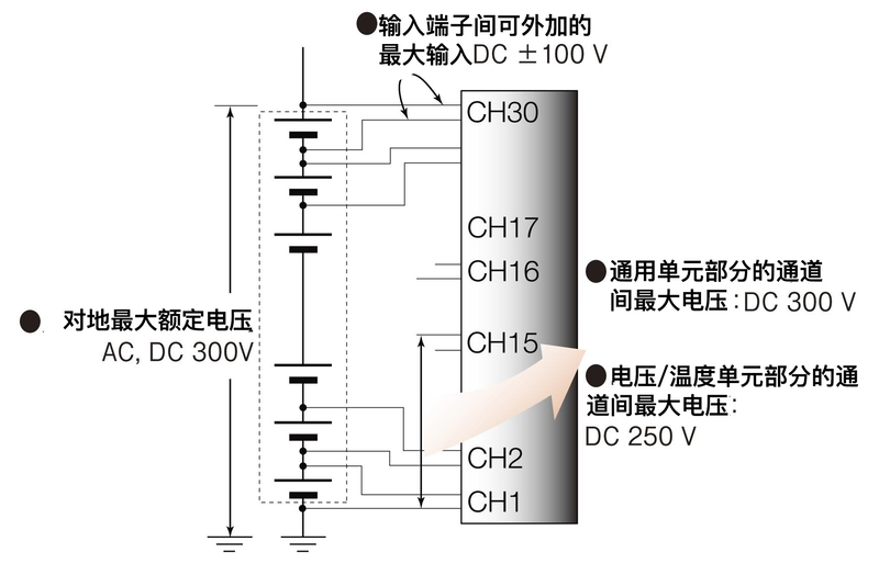 因為通用單元的通道間最大電壓為DC300V和高耐壓,所以能安全的進(jìn)行測量。